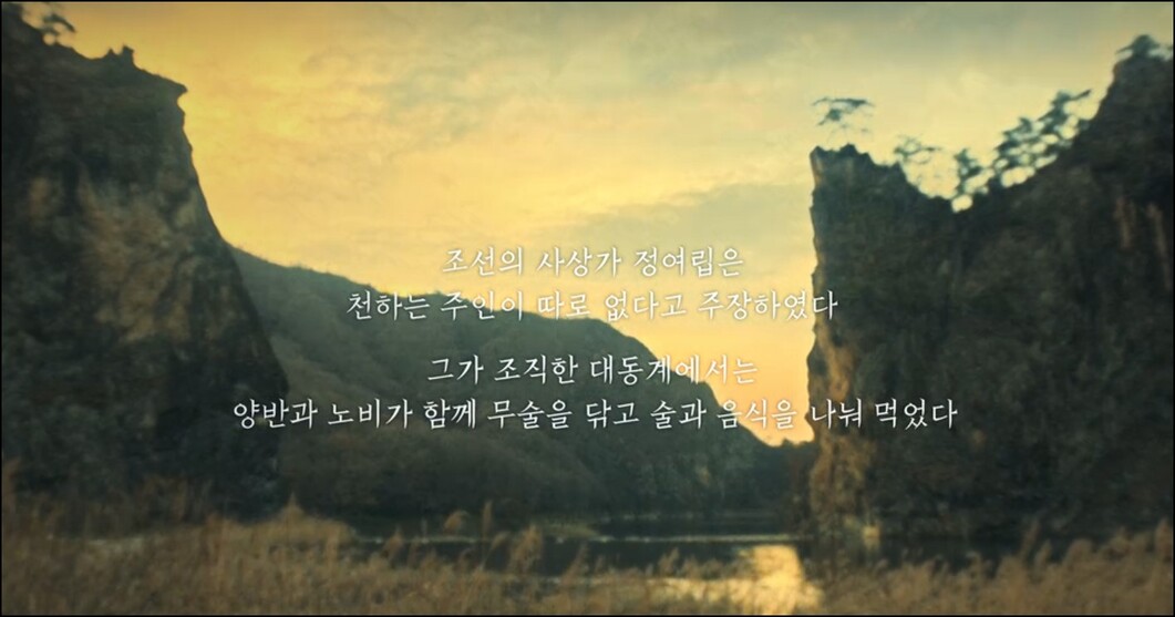 정여립은 조선 중기, 조선 사회의 신분제와 권력 구조에 저항하며 평등을 주장한 인물입니다. 그는 대동계라는 비밀 결사를 조직해, 당시 조선 사회가 필요로 하는 개혁을 주장했습니다. '대동(大同)'이란, '천하는 모두의 것'이라는 사상을 바탕으로 한 평등주의적인 사고를 담고 있었습니다. 정여립은 동인으로 전향해 주요 인물이 되었지만, 그의 개혁적인 성향은 서인에게 위협으로 여겨졌고, 결국 그는 반역자로 몰리게 됩니다.